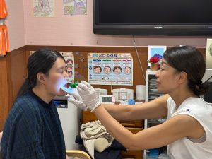 効果的な口腔ケアには、まず口腔内の状態を正確に把握するための「視野の確保」が重要です。プロフェッショナルは左手の指を入れ視野を確認し、アマチュアはそのまま右手のブラシを入れる」という五島先生の教えのもと 、頬を横に開く技術を確認しました 。また、ペンライトやデンタルミラーを用いることで、歯の裏側までしっかりと観察できます♪