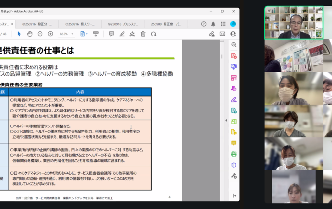 今回の研修で得た知見は、サ責が訪問介護の「要」として、その専門性を十分に発揮し続けられる環境を整えるための重要な一歩となります。事業所全体で業務プロセスの見直しと改善を継続してまいります!