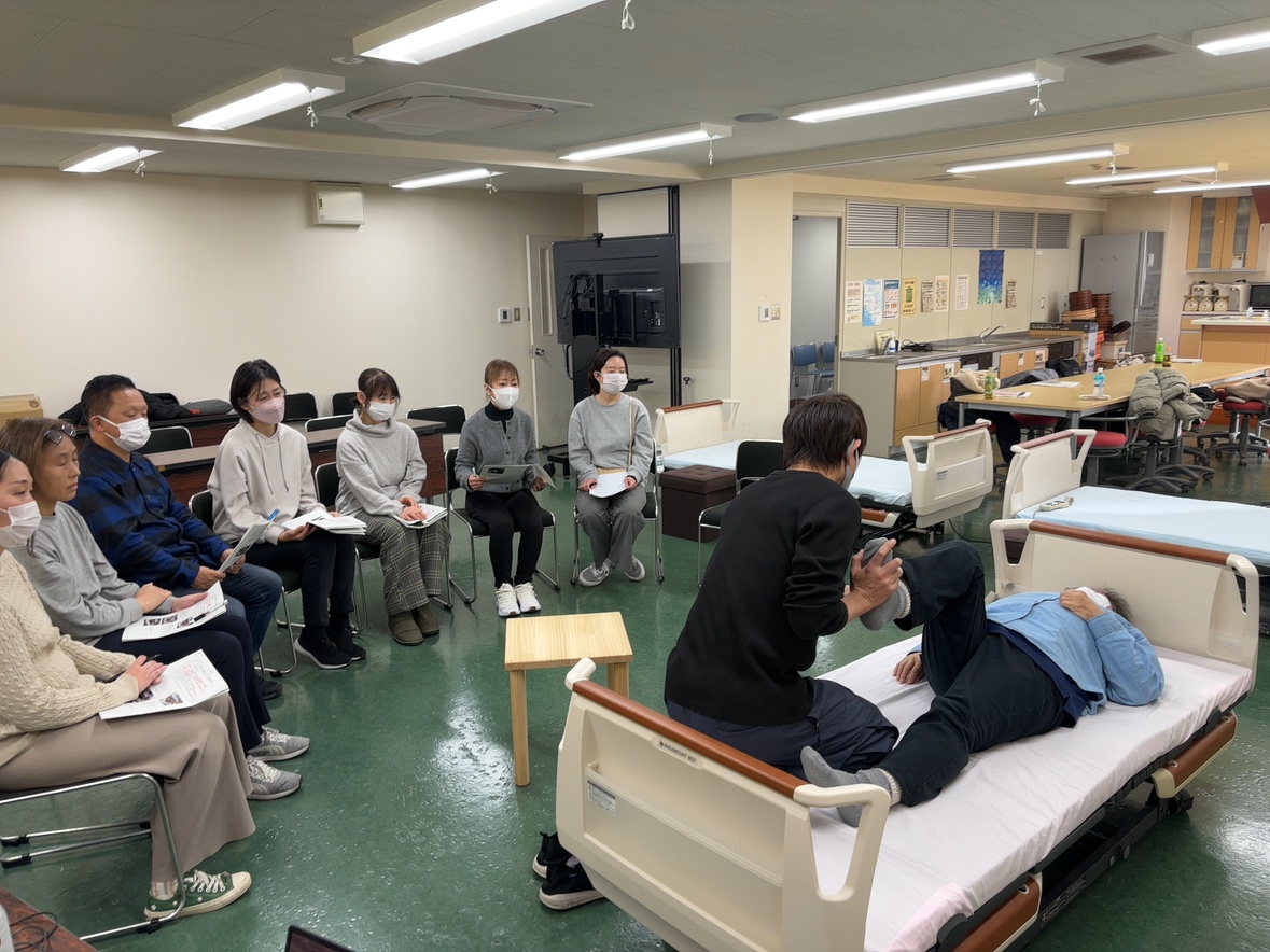 起き上がり動作、おじぎ体操・お尻上げ体操、三角移乗、トイレ介助、入浴介助などの場面での「具体的な介助方法」について、受講生一人ひとりの「気づき」を深めました!