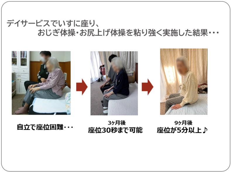90代・要介護4のご利用者が、おじぎ体操・お尻上げ体操を粘り強く継続した結果、座位保持が困難だった状態から5分以上座れるようになり、認定更新で「要介護3」へ改善された事例も共有されました♪