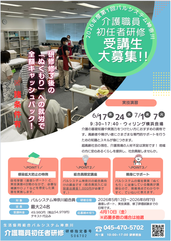 講師は、パルシステム神奈川のトップ認定者である福祉事業課の蕨さんが務めました。訪問介護の管理者を歴任するなど豊富な経験を持ち、先日報告いたしました一般社団法人コープ福祉機構主催の「生協10の基本ケア講座」でも実技指導を担当された、指導技術に優れた職員です♪