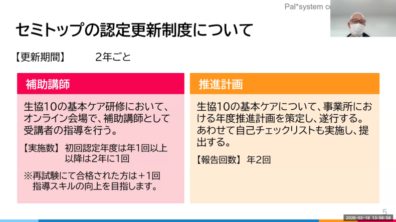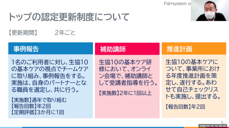 今回のガイダンスは、認定後のさらなる飛躍を期待するとともに、資格継続に欠かせない「更新制度」や「生協10の基本ケアのさらなる浸透」について共通認識を持つことを目的として実施しました♪
